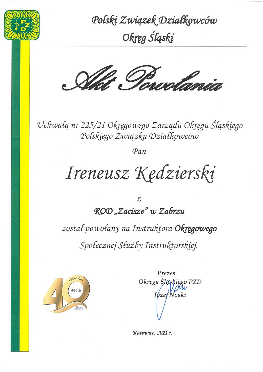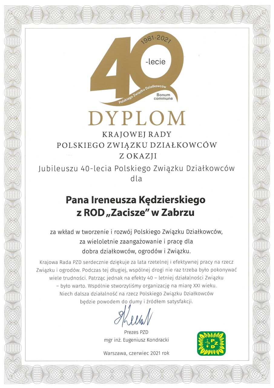 Prezes Zarządu ROD Zacisze Ireneusz Kędzierski otrzymał dyplom uznania za wkład w tworzenie Polskiego Związku Działkowców, za wieloletnie zaangażowania i pracę dla dobra działkowców, ogrodów i Związku oraz Akt Powołania na Okręgowego Instruktora Społecznej służby Instruktorskiej.