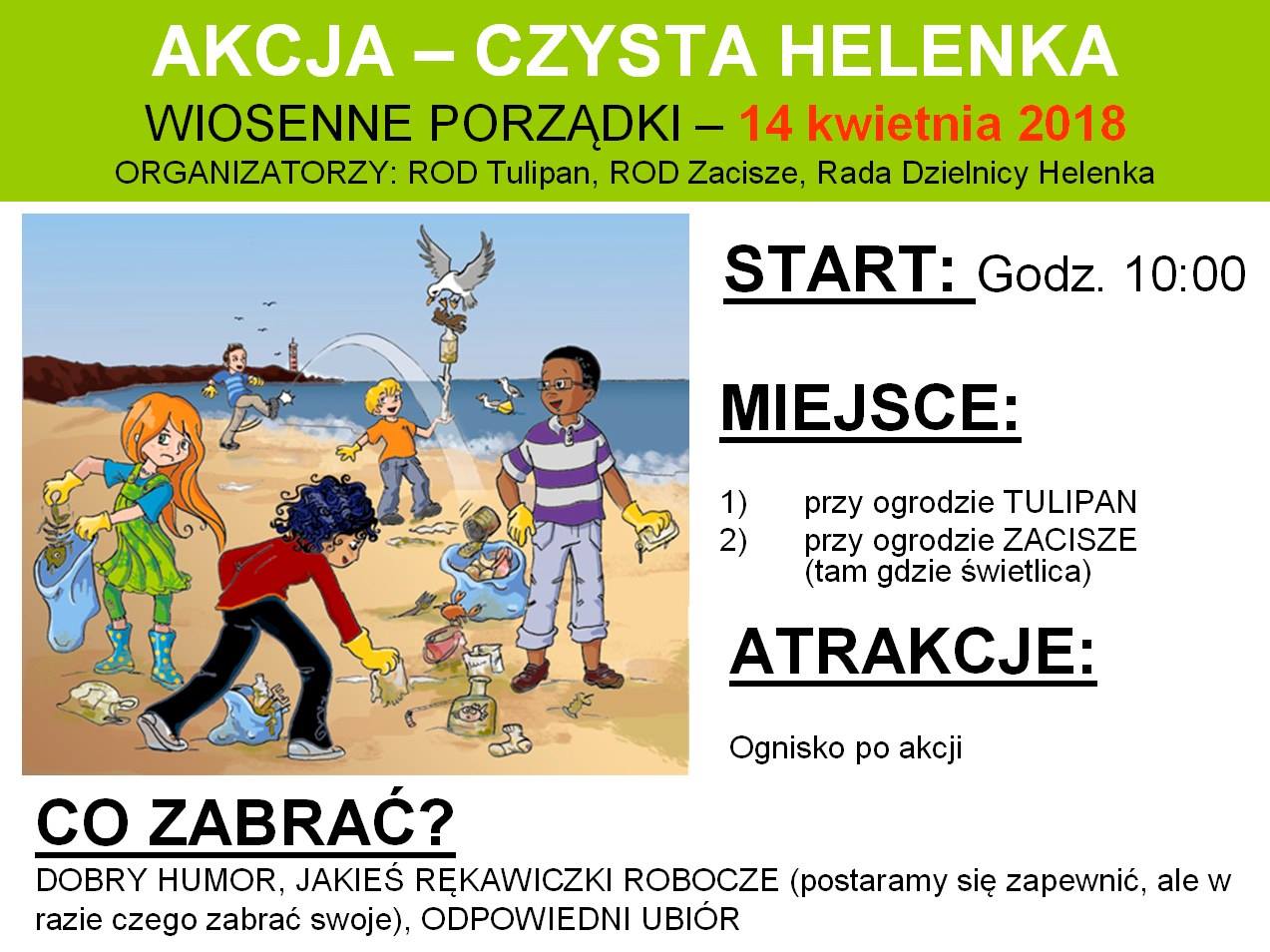 Zapraszamy 14.04.2018 o 10:00 na akcję sprzątania naszej dzielnicy. Pewnie denerwują was porzucone śmieci i firmy lub wspólnoty twierdzące, że to nie ich problem, małpki wystające z każdego miejsca i porzucone opony. Dołączcie do Rady Dzielnicy Helenka i ogrodów Zacisze i Tulipan a razem będzie na pewno ciekawiej i zabawniej, liczymy potem na jakieś zabawne fotki, żeby zrobić ciekawy reportaż z imprezy. Zabierzcie znajomych i dzieci, przyszła sobota - najpierw sprzątanie a potem ognisko na Tulipanie. ZAPRASZAMY!!!