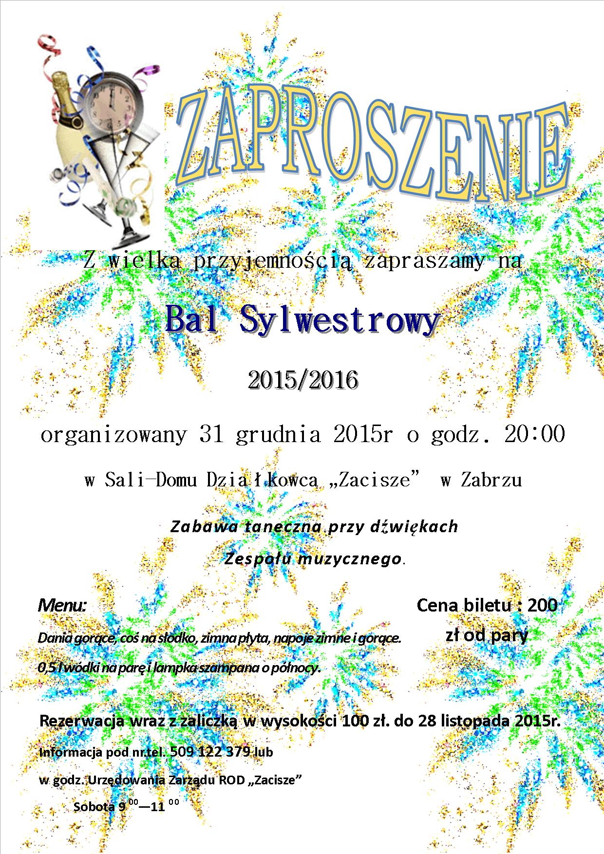 Z wielką przyjemnością zapraszamy na bal sylwestrowy 2015/2016 organizowany 31 grudnia 2015 godz. 20.00 w sali-domu działkowca Zacisze w Zabrzu. Zabawa taneczna przy dźwiękach zespołu muzycznego. Cena Biletu 200 zł od pary w tym 0,5 l na parę szampan o północy, dania gorące coś na słodko.  Zimna płyta napoje zimne i gorące. Rezerwacja wraz z zaliczką w wysokości 100 zł do 28 listopada 2015r.